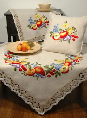 Великолепная скатерть из полиэстера, выработка под лен. По всему краю пришита тесьма с имитацией ручной обвязки. А по всей скатерти вышитые вручную фрукты и ягоды в ярких тонах. Эта скатерть не останется не заметной в Вашем доме и по истине будет изысканным украшением, которое можно передавать из поколение в поколение! Изделия из полиэстера легко стирать: они не мнутся, не садятся и быстро сохнут, они более долговечны, чем изделия из натуральных волокон.
