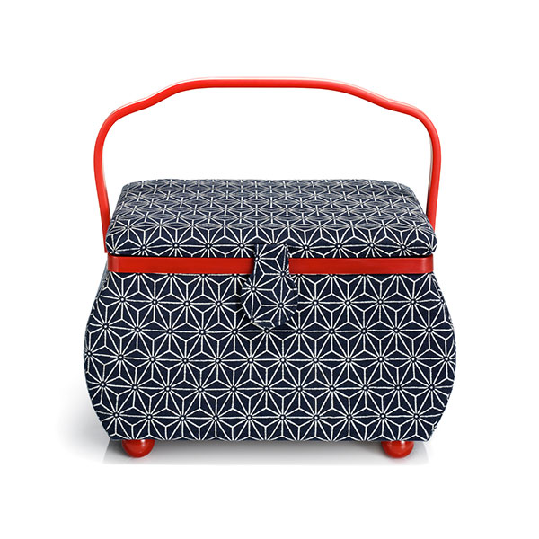 Большая, выпуклая корзина для рукоделия «Kyoto» очаровывает своим оригинальным видом. Темно-синяя хлопчатобумажная обивка с современным геометрическим рисунком удачно контрастирует с ручкой и исключительно привлекательной красной окантовкой. Внутри корзина для рукоделия также может многое предложить: выдержанный в красном, великолепный интерьер обнаруживает много места для хранения швейных принадлежностей. Съемная пластиковая вставка с семью практичными отделениями обеспечивает достаточное пространство для хранения мелкой галантереи, например, наперстков или катушек. Внутренняя часть крышки содержит игольницу и два пришитых тканевых кармана для дополнительных принадлежностей, таких как измерительные ленты, ручки и многого другого.