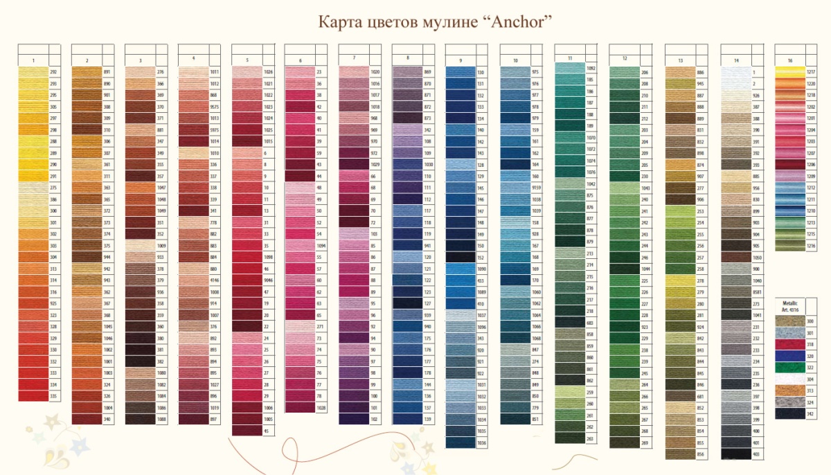 Мулине Anchor "Stranded Cotton", 100% длинноволокнистый мерсеризированный хлопок, длина 8м (12 пасм в упаковке)