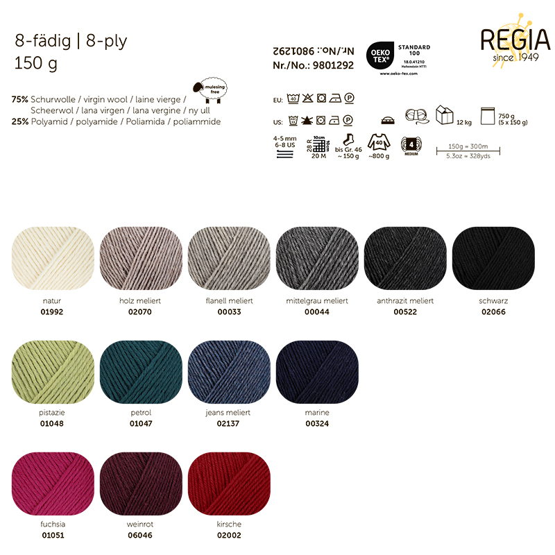 Пряжа Regia - это премиум материал, который славится своей прочностью, износостойкостью и качественной окраской. Нейлон в составе обеспечивает долговечность изделий, предотвращая их истирание. Мериносовая шерсть добавляет мягкость и комфорт. Цвета пряжи яркие и стойкие: они не выгорают и не линяют. Хорошая скрутка предотвращает распадение ниточки во время вязания. Благодаря этим свойствам, из пряжи Regia можно создавать разнообразные изделия: носки (главная специализация, недаром её называют носочной пряжей), варежки, митенки, перчатки, свитеры, шарфы и детские вещи (мягкая и гипоаллергенная). Если вам нужны долговечные носки, качественная мериносовая пряжа без колючести и красивая, стойкая окраска, то пряжа Regia - идеальный выбор! Можно стирать в стиральной машине.Одного мотка пряжи хватит на носки до 46 размера, а для свитера того же размера потребуется около 6 мотков.