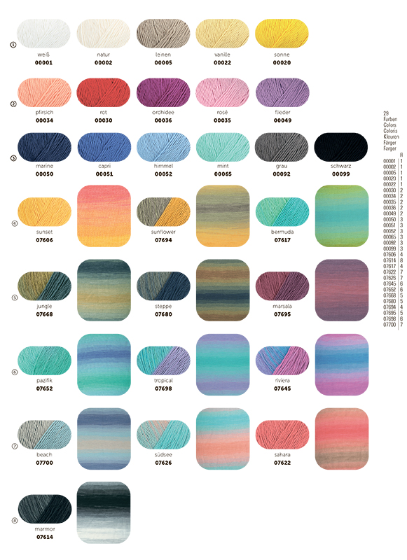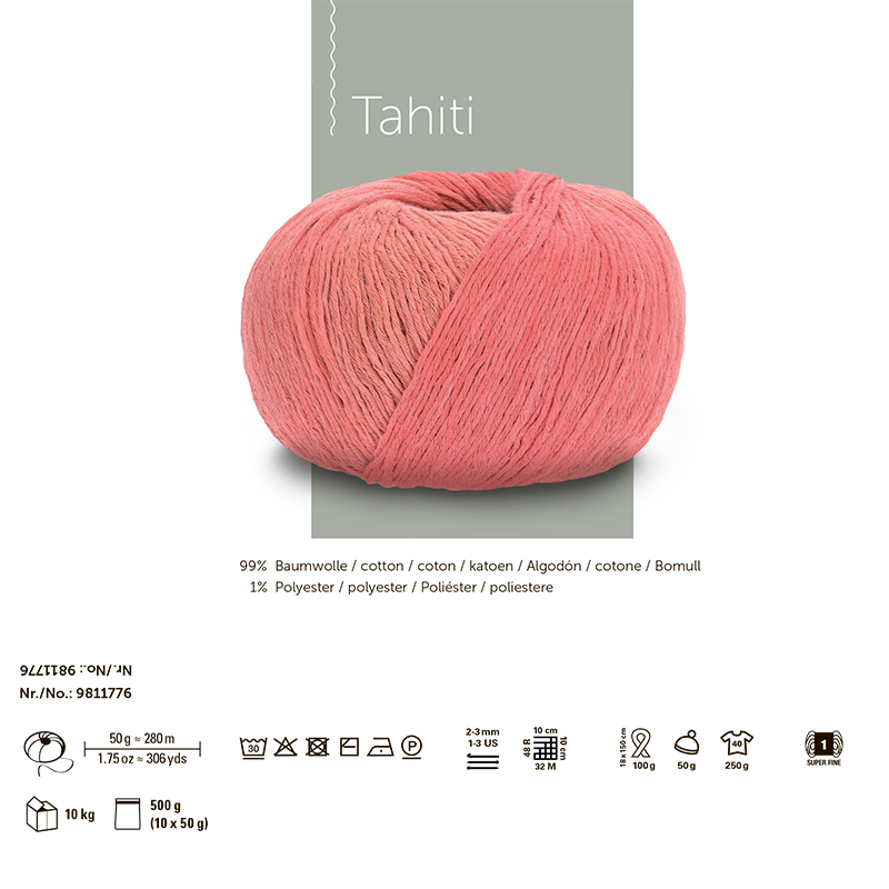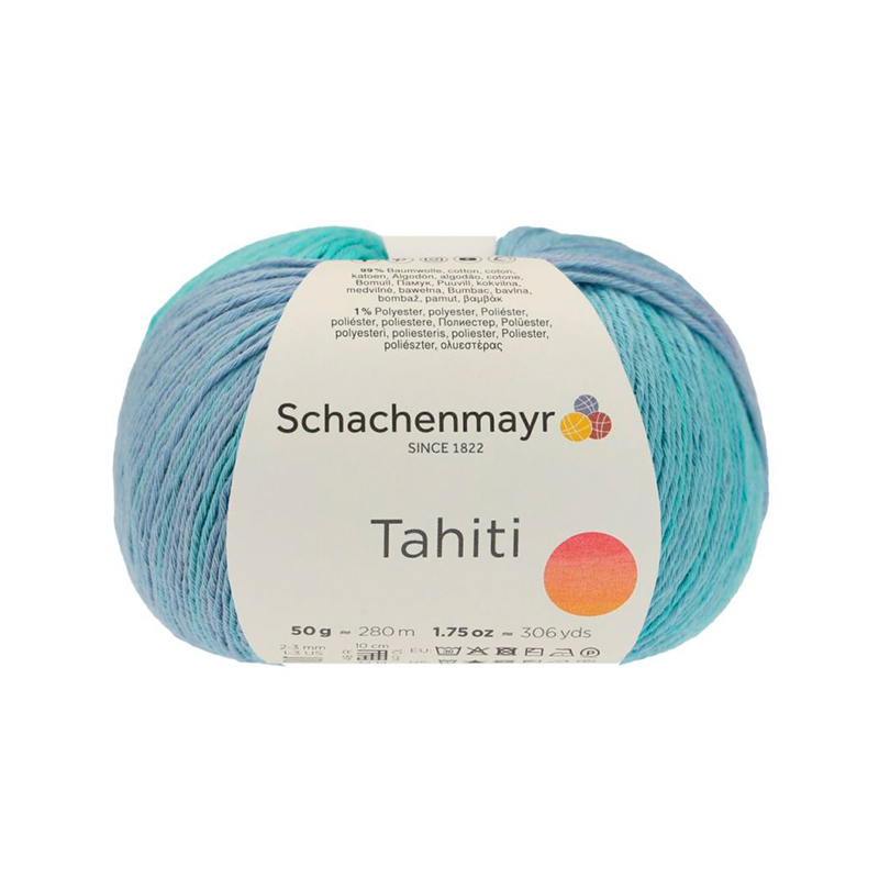 TAHITI-это пряжа от немецкого бренда Schachenmayr, известного своей высококачественной пряжей для вязания и рукоделия.Tahiti,лёгкая летняя пряжа с изысканным батиком станет настоящим украшением вашего гардероба. Производитель мастерски окрашивает нити, создавая яркие и плавные цветовые переходы.Всего1%полиэстера придаёт изделиям эластичность, позволяя вязать спицами большого диаметра без риска деформации.Пастельные и насыщенные оттенки идеально подходят для ажурного вязания.Они напоминают о красоте южной части Тихого океана, перенося вас в мир экзотики и уюта.Нежные тона, как волны на море, гармонично сочетаются между собой, придавая вашим вещам свежесть и лёгкость.Пряжа на 99% состоит из хлопка, что делает её приятной на ощупь, идеально подходит для летних топов и аксессуаров.Побалуйте себя "таитянским" колоритом прямо у себя дома! На изделие 46 размера с коротким рукавом понадобится всего 250 рамм пряжи, если вы будете использовать спицы №2-3мм.Деликатная стирка при 30 С, сушить горизонтально в полутени.