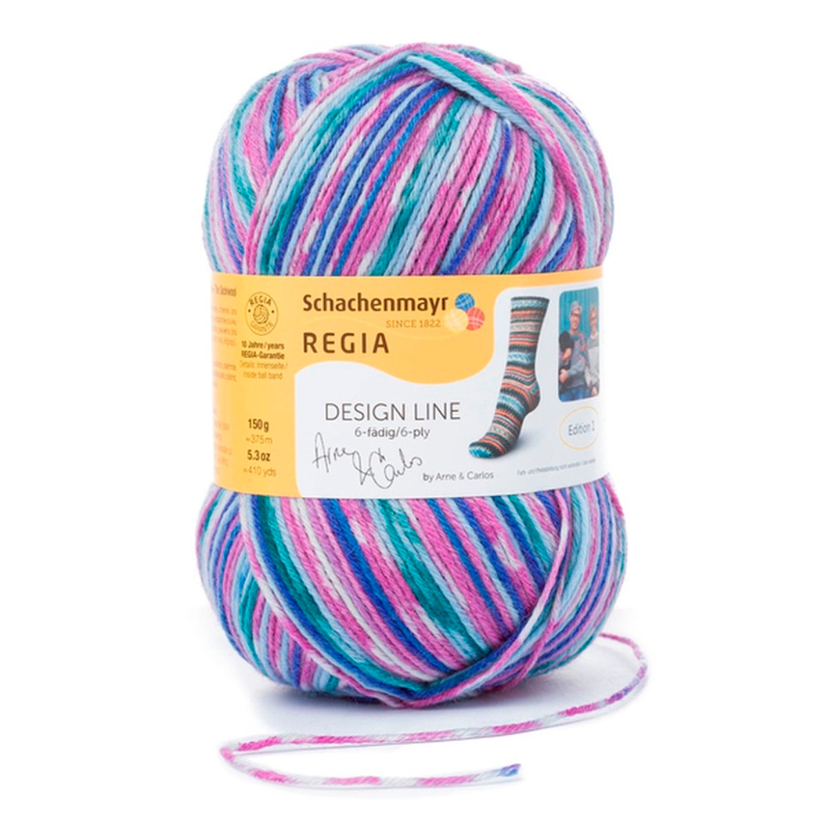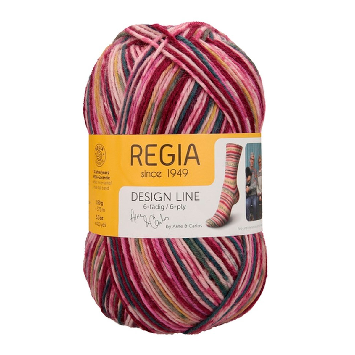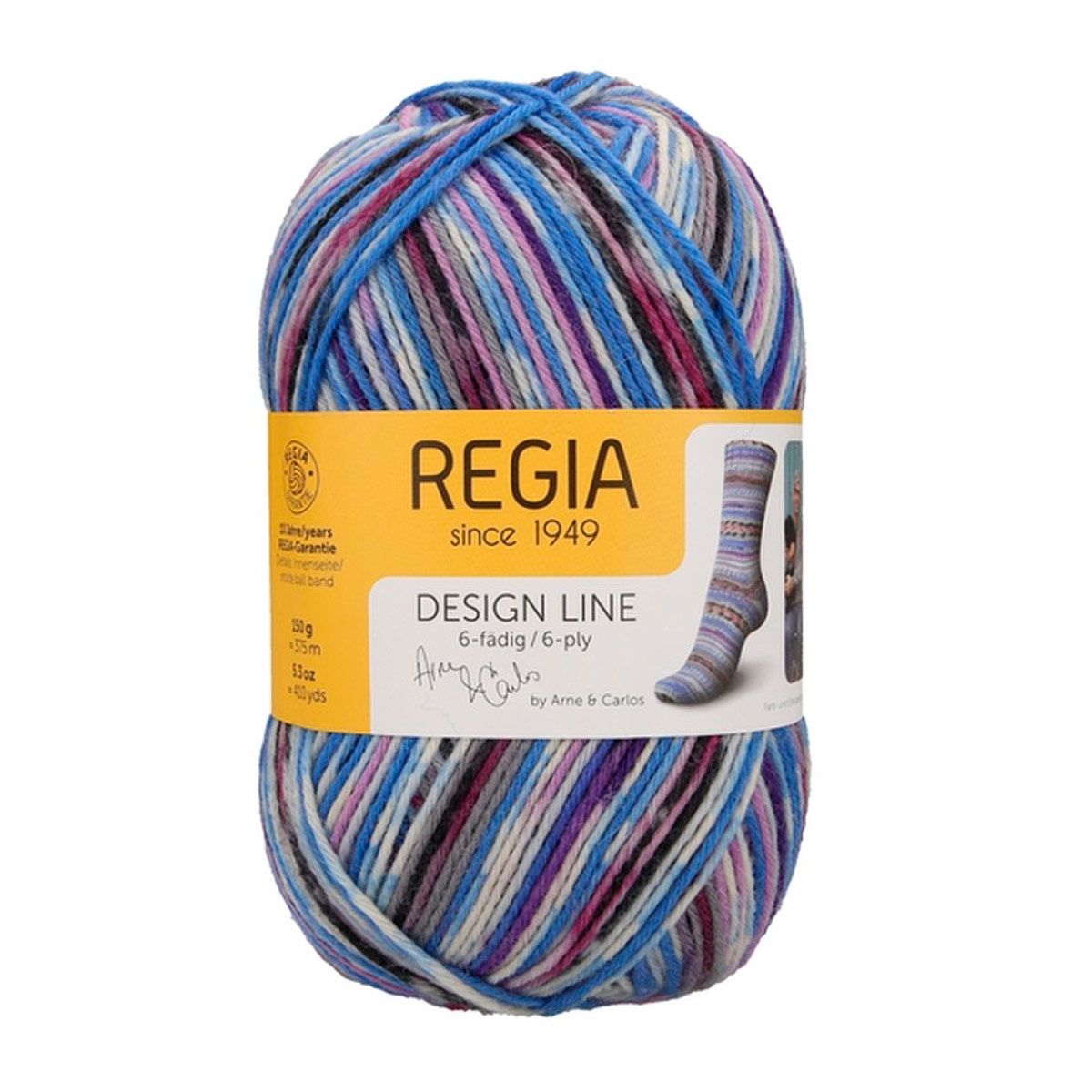 Regia Design Line – это коллекция немецкой пряжи для вязания носков и других изделий. Она отличается высокой износостойкостью, насыщенными дизайнерскими цветами и превосходным качеством. Regia Arne & Carlos – результат сотрудничества с известными дизайнерами. В этой линейке представлены уникальные расцветки и узоры: полосатые, меланжевые, градиентные, которые вдохновляют на создание самых смелых вязаных изделий. Пряжа подходит для носков, а также для легких свитеров, шапок и перчаток. Она прочная, с яркими цветами, удобна в работе, не колется и хорошо скользит по спицам. Можно стирать и сушить в стиральной машине при низкой температуре.Одного мотка пряжи хватит на носки до 46 размера, а для свитера того же размера потребуется около 5 мотков.