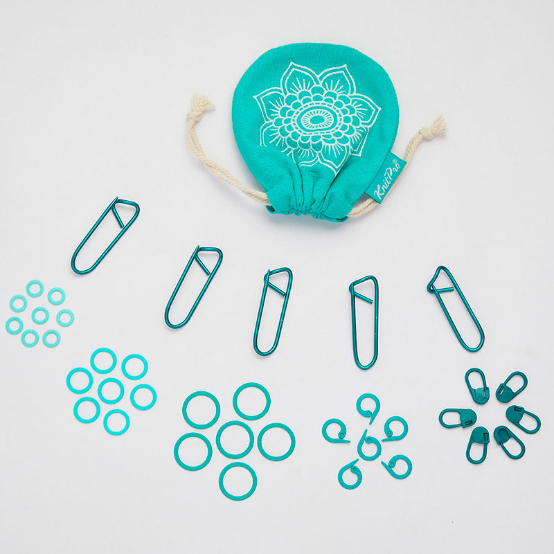 Набор маркеров для вязания "Mindful": булавка - 20шт, круг - 20шт, кольцо - 60шт разных размеров, пластик, бирюзовый, 100шт в мешочке