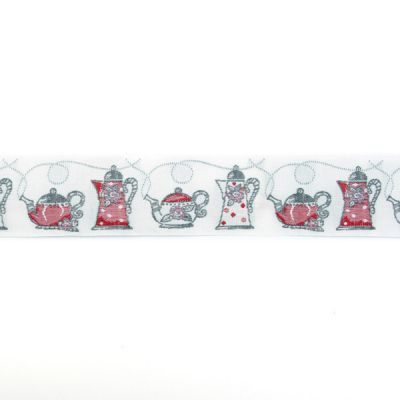 Тесьма декоративная "Чайники", ширина 30мм (основа 100% полиэстер, рисунок 100% хлопок), белый/красный/серый